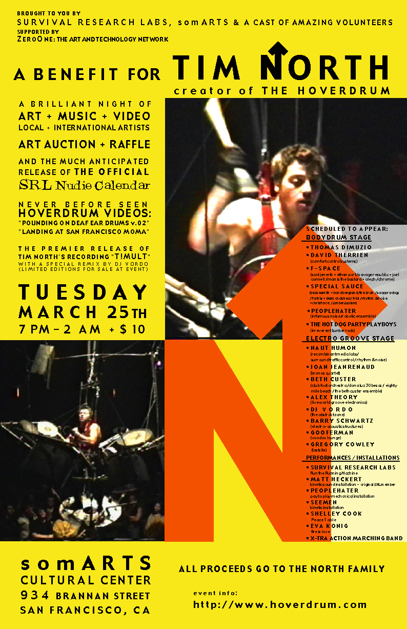 This is an evening to raise cash for Tim North and his family in time of real need. Brought to you by Survival Research Labs , SomArts and a cast of amazing volunteers......... Supported by ZeroOne: the Art and Technology Network |