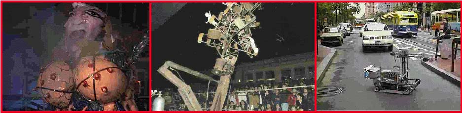 SRL staged the “What is Real” show in connection with the Web 98 conference in San Francisco on June 25 th 1998 for an audience of 3000. The location was the lot under Highway 101 between Perry and Stillman Streets. (SRL staged another event at the same location in 1989, “Illusions of Shameless Abundance”). This was the stinkiest event SRL ever produced and that’s saying something. Thanks to the tireless efforts of Scott Ficus and Kimric, members of the audience and some of the SRL crew lost their digestive composure, adding to the extensive cleanup after the show. Lots of really weird props: glass office cages populated by animatronic figures, 8ft tall animated mud wrestling men, tormented white collar workers being blown to bits by the Big Shockwave Cannon, Steve Hecks 40 ft. tall tumbling water filed towers, a 12 ft. long rotating baby chair screw device, etc. All of which was summarily destroyed by the Hand-o-God, the Subjugator, the Air Launcher, the Inchworm, and the Triangle Machine. All of which was accompanied by the beat of relentless blasts from the Shockwave Cannon and genuine GX soundtrack. A fun little event in hometown SF. In the days leading up to the main event SRL staged three internet based machine control events. In the first, the Keynote presentation took place in Moscone center with presentations by Natalie Jeremejenko, Eduardo Kac, Eric Paulos, and Mark Pauline. To illustrate the operation of lethal machinery over the internet, the Air Launcher (located at the SRL yard), was aimed through an on screen control panel and fired incendiary projectiles at an assortment of props in the SRL yard from Moscone center during the presentation . In the second event, a jet engine powered flame-thrower mounted on the SRL flatbed pulled up to a location in the South of Market area and was connected to a wireless I0 megabit network. It was then operated remotely from Moscone center and incinerated a flailing multiarmed robot for an audience on several hundred puzzled bystanders, including one extremely irate local businessman who kept attempting ( unsuccessfully) to grab the laptops being used to operate the devices for the event. The third event took place on Market street and involved the Track Robot a one armed tracked robot similar to police bomb removal robots. It was operated teleroboticallyi by several random persons who stopped by the SRL booth at Moscone center. Generally, it was used to harass passerby and stop traffic on Market street for two hours.