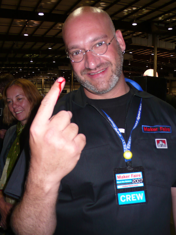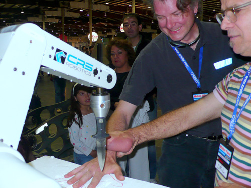 Originally a CRS A255 robot arm used at a lab to move beakers around, the Stabber aka Mumbly Peg was picked up by Mark Pauline at HMR on a tip from Bob Taylor. It was then given gangsta behaviors by Karen Marcelo at its new lab. |