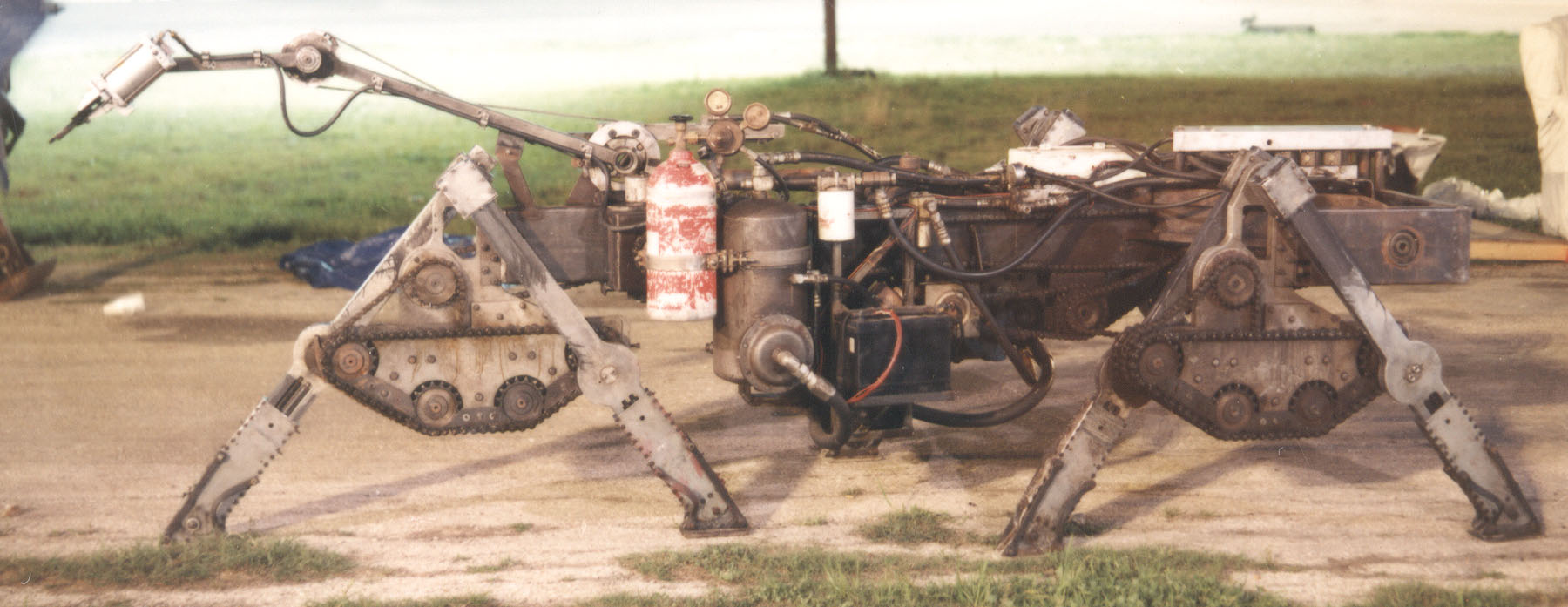A six-legged affair made in 1992 powered by a small gas engine, a Vickers piston pump and a wicked looking chain drive. A moving, articulated arm on the front of the machine carries a cutter which severs cables, or can be interchanged by a stabbing knife, claws, etc. With a top speed of 6mph, this is the fastest leg-powered machine in the world. It has the longest range, about 40 miles. Mark Pauline got the idea for the drive from articles on Hughes' gatling gun loading system. They were having problems making parts strong enough to handle the high peak loads of moving ammo at 600 rounds/sec and still small enough to fit into an aircraft system. Mark realized this was the same problem machines with legs had. Peak loads make the linkages fail and limit the speed the legs can move. The chain drive Mark came up with is reliable, runs for hours and because the chains are strong, is efficient.