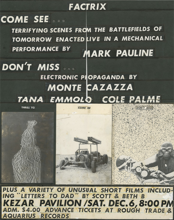 A mechanical enactment of scenes from the battlefields of tomorrow with Factrix, Monte Cazazza, Tana Emmolo, and Cole Palme. A few short films were also shown including "Letters to Dad" by Scott and Beth B.