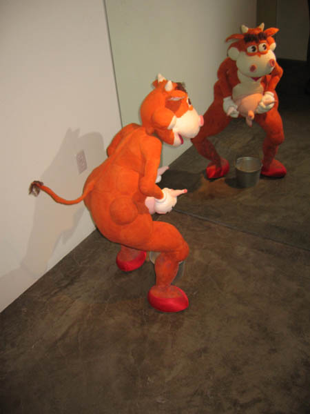 Some orange cow milking itself in a nearby gallery