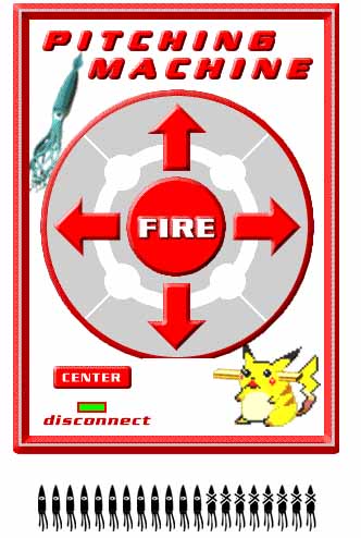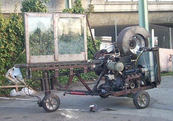 The Pitching Machine is the most dangerous machine at SRL. It has a 'magazine' that holds 30 2x4 boards which is shot out of the machine at 135mph, 2 boards per second. The range is about 100 yards or more. Wood will go through 1/4" steel plates and concrete. It has a tethered joystick control for aiming and firing as well as a web interface to allow for remote operation of the machine. It made its tele-operated debut in Tokyo where a user at the ICC a few miles away was able to demolish targets in Yoyogi Park. It was coded in such a way that it can be fired continously while the user pans and tilts the machine for a fully automatic strafing effect.