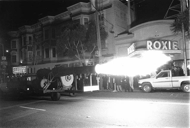 The V1 on a flatbed truck is driven down 16th Street in front of the Roxie Theater which is