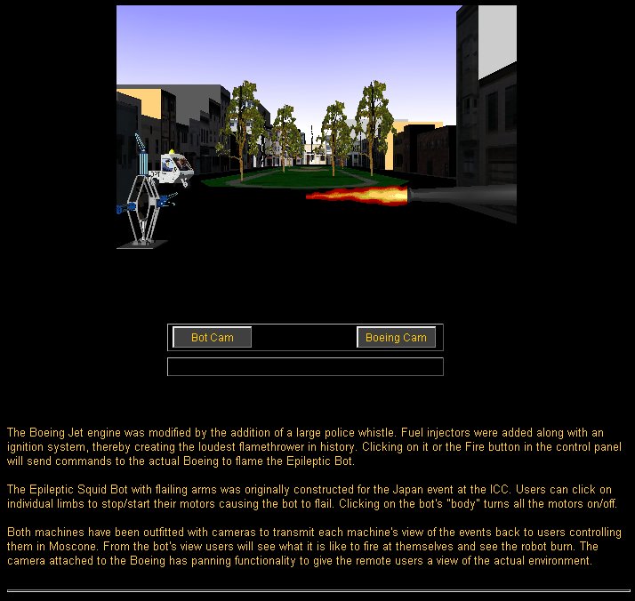 The actual event lasted 15 minutes. The Boeing and Epileptic Bot were placed on a flatbed truck at the 3rd St. end of South Park.   After the Bot was flailed and torched by the Boeing, the truck took off just in time for the police and fire dept responding to a call, to arrive at a scene of people randomly milling around an empty space in the shape of a flatbed truck.   Images of the event courtesy of Gabriella Marks.